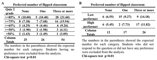 High performing students preferred to have more flipped classroom modules. (A) Contingency table showing the observed number of students who preferred to have none, one, and three or more flipped classroom modules in physiology stratified with their performance in Quiz 2. Chi-square test showed significant difference (p < 0.01). (B) Contingency table showing the observed number of low performers and high performers in the cumulative final who preferred to have none, one, and three or more flipped classroom modules in physiology. The lower 27% and upper 27% of the class were identified based on students’ performance in the cumulative final exam in the second quarter. The lower 27% were considered low-performing students, and the upper 27% were considered high-performing students. Chi-square test showed significant difference (p < 0.01).