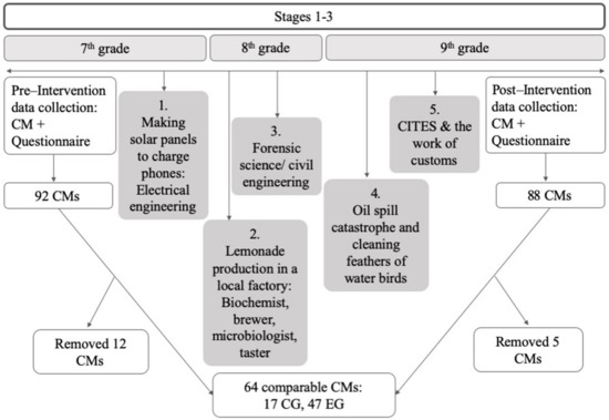 The study followed a longitudinal, pre-test, post-test design (Stages 1–3, Figure 1). Over a period of three years, five different STEM-related, careers-introducing, teaching and learning modules (TLMs) were implemented by pre-trained science teachers (c.f. [37]) and possible effects on experimental group of students’ SCA were determined via the implementation of a questionnaire [45], plus the development of concept maps. The latter is under investigation in the current article. The control group was taught, following the Estonian National Curriculum for Basic Schools [13] and no extra activities for supporting science-related career awareness were implemented. The control group answered to the questionnaire and developed their concept maps in 7th grade and in 9th grade.