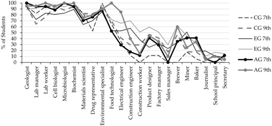 Although there are studies that determined students’ career awareness changes, induced by an intervention (e.g., [17,18]), few have addressed middle school students in a longitudinal intervention setting (e.g., [19]). Also, the effects of these studies have been determined, either through self-reported growth in career awareness and perceived applicability of science competences [18,20], or with questionnaires, addressing gains in awareness of various science-related occupations [17].
