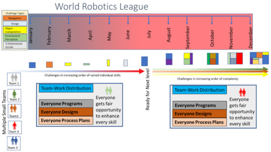 Pretty much all the studies reported so far consider a point of view that aligns with classroom environments. Given the nature of competitive robotics in having similarity to sports, it is very important to take into consideration the impact of sports in psychological and intellectual development and observe certain aspects of competitive robotics in the context of sports. For an individual, participation in sports provides an opportunity for a very objective evaluation, introspection, and application of skills in many ways. Sports has also shown a positive impact on skills such as coordination, quick introspect and improvement, attention, and planning [12,13]. Competitive robotics when executed within tenets of sports can have a very positive impact on a child’s intellectual development. In a study of adults [13] who had socially vulnerable childhoods, it was found that (1) sports provided a valuable avenue to disconnect from other domains of day-to-day life while receiving support, appreciation, and feedback; (2) a venue to self-reflect and find insights about themselves; and (3) sport can become a valuable instrument to reach goals. In another study [14], it is suggested that visibility of skills, engagement in challenges, and confidence translate into an overall positive and fruitful experience in sports. The role of a competent coach is cornerstone of the overall impact.