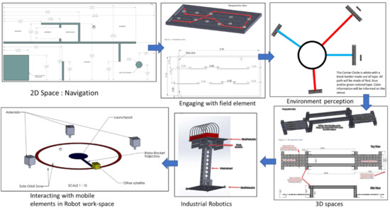 Application of the robots subdivide them into mobile and non-mobile robots [6,7]. The kinematic control of the robot further classifies it as autonomous or a teleoperated system. However, within competitive robotics most of the challenges are based on mobile robots. At the start of the game, the robot is placed in what is referred to as robot base. During the game, the robot travels to different part of the robot field and completes a variety of tasks. The tasks may include pushing, pulling, moving objects, actuating mechanisms, etc. The robot game is usually time bound. The scores assigned are based on total tasks performed within specified challenge duration. In case any exceptions are made, a penalty is assigned. The penalty may negatively impact the total score. In many other competitions, such as robo-soccer, sumo-robots, or one-robot events, multiple robots compete as opponents and the scores are determined not only by the robot’s direct accomplishment but also by inhibiting the opponent. Contrary to expectations, most of the competitions require running the robot in teleoperated mode. Using robots in an autonomous fashion is extremely limited.