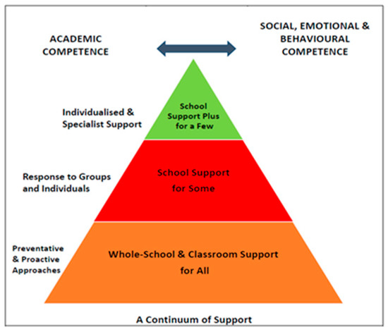 A multi-tiered system of support (MTSS) is an evidence-based framework based on three tiers of support aimed at assisting at-risk students [30] and complements Hornby’s model of inclusive special education in that it is intended to support implementation of a systematic and adaptive approach to meeting the needs of students with SEND. MTSS frameworks exist in many countries internationally, such as Finland, USA, Canada, England and Australia, and are mandated in some jurisdictions like Finland [17,24,31,32]. Interventions to support students can range from school-to community-based approaches to support common needs of students at tier one, to more distinct and unique needs at tiers two and three. The Continuum of Support (CoS) (Figure 1) [33,34] is an example of a MTSS for students with SEND, and more broadly for students at risk, and frames the response to intervention in Ireland [35]. The CoS provides a graduated solution-oriented framework of assessment, intervention and evaluation in mainstream primary and post-primary schools, with an emphasis on academic, social, emotional and behavioural supports. For schools to address the needs of all students three distinct school-based processes exist: school-wide and classroom support (support for all); school support (support for some); school support plus (support for few). Whole school and classroom support involve processes of prevention, effective mainstream teaching and early identification. These systems are available to all students and in theory should effectively meet the needs of most. Considerable emphasis is placed on the provision of appropriate classroom-based preventative interventions and in-class support in preference to withdrawal methods of educational support [14,17,35,36].