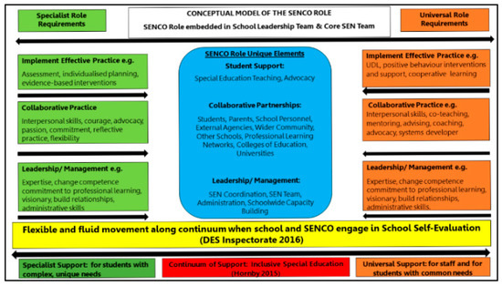 - Fitzgerald, J.; Radford, J. The SENCO role in post-primary schools in Ireland; Victims or agents of change? Eur. J. Spec. Needs Educ. 2017, 32, 452–466. [Google Scholar] [CrossRef]