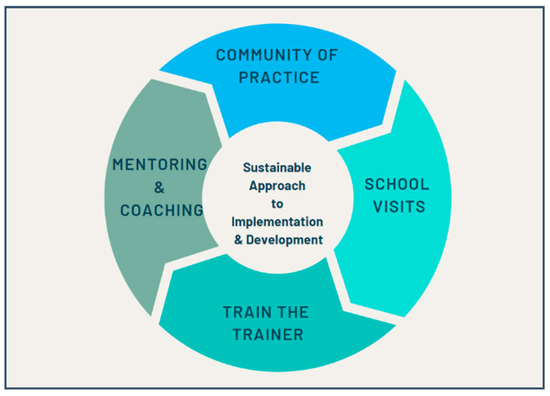 Implementation of any school-wide intervention is linked to sustained support and professional development [52]. While professional learning is a highly individualised endeavour, models supporting transformation are those identified as collaborative, grounded [53] and adaptive [52]. Multi-modal approaches to initiative implementation in this study are illustrated in Figure 5. Approaches embraced situated, school-based learning involving school visits, training of trainers, coaching, mentoring and collaborative communities of practice [54] aimed at facilitating interpretation and customised translation of policy into practice [40].