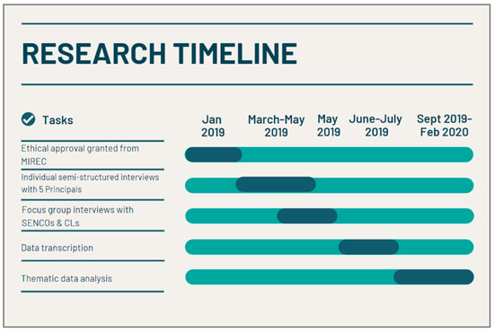 In December 2018, it was agreed to undertake a review of the pilot and we developed a research plan as outlined in Figure 6, applied for and were subsequently granted ethical approval through Mary Immaculate Research Ethics Committee (MIREC Ref: A18-055/21 January 2019), and engaged in data collection. The following research questions guided focus group interviews with SENCOs (n = 7) and curriculum leaders (n = 3), and individual semi-structured interviews with principals (n = 5):