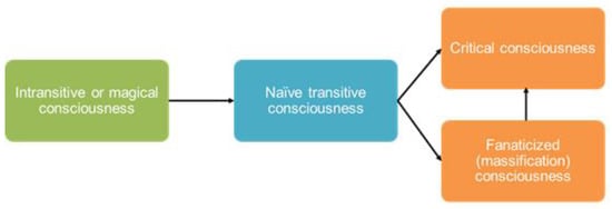 In his early work, Freire theorized conscientização as a process with a set of stages. The first stage is the intransitive or semi-transitive consciousness or magical consciousness. This stage is characterized by acceptance and resignation, where individuals fail to perceive many of the contemporary challenges. The second stage is naïve transitive consciousness, which is characterized by “an oversimplification of problems” [14] (p. 18), where individuals may see themselves as righteous and blame others for problems. Naïve transitive consciousness is important, because it is here where individuals are able to perceive unjust social power structures, investigate their causes, and “begin to be able visualize” alternatives [15] (p. 77). The outcome of this exercise should lead the individual toward the third stage, which is characterized by two opposing consciousnesses: conscientização (i.e., critical consciousness) and fanaticized (massification) consciousness (see Figure 1), the former being desirable [14] (p. 16). Fanaticized (massification) consciousness is a stage in which individuals are “more disengaged from reality”, which “leads to passivity, fear of freedom, and the loss of reflective action among the people” [14] (pp. 19–20). The opposing stage, conscientização or critical consciousness, is where individuals begin to understand causal principles of social injustice. While in the stage of naïve transitive consciousness, change “focuses on altering individual behavior”, in the critical consciousness, these changes focus “on systematic, structural, and normative obstacles” [14] (p. 39).