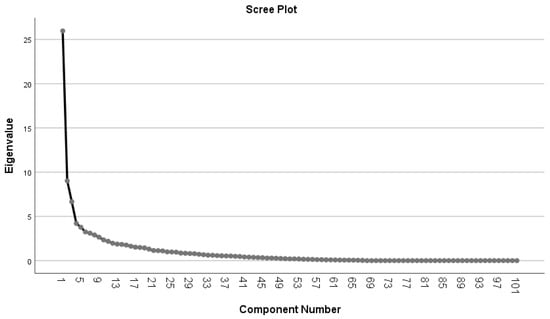 Analysis of the correlation matrix displayed many correlation coefficients of 0.3 and above in this study, as recommended by Tabachnick and Fidell [32]. Nine items were dropped because of relatively low correlations with other items. Pearson’s critical correlation value was used for a significance level of α = 0.025 with n = 70 for a two-tailed test (r = 0.232) to establish items with low correlation values. Therefore, nine items which had less than 95% of r < 0.232 were dropped. An EFA on the 92 remaining items was then conducted.