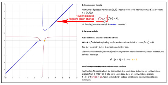 When designing online materials (Figure 3), we took advantage of the dynamic behavior of JavaScript reactive elements to show an immediate connection between the mathematical language and the visual representation of solved problems. Mouse interactions with mathematics content written with LaTeX triggers a change in various parts of the web page, mainly emphasizing the graph parts by changing their color or thickness. This way, students gain a better understanding of the underlying mathematics.