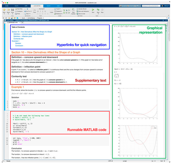 Interactive learning material is important to support students to actively engage with the learning material. MATLAB Live Editor is a feature introduced in version R2016a. It provides an interactive environment in the form of interactive documents resembling Jupyter notebooks, which are often used by data analysis practitioners. Live Scripts combine MATLAB code with formatted text, equations, and images (Figure 4).