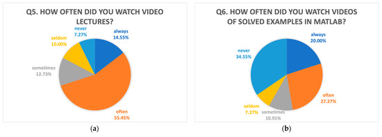 The questionnaire was divided into three parts. The first part looked into the participation of students in the online lessons (lectures and exercises) and their rating (Q1-Q4). The questions in this part used a five-point scale (5—always/excellent; 4—often/good; 3—sometimes/average; 2—seldom/poor; 1—never/N/A).