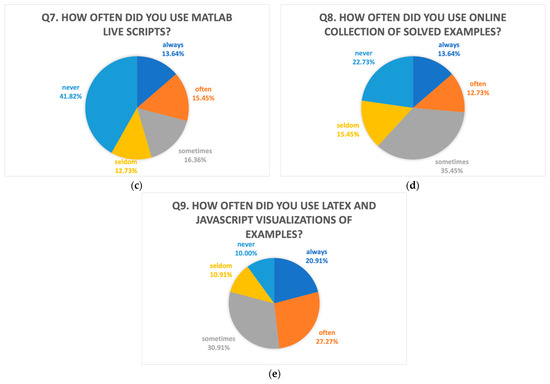 Four of the questions (Q1-Q4) were related to distance learning, including participation in online lessons (F1) and satisfaction with them (F2). The remaining five questions (Q5-Q9) focused on self-education using supporting online materials. This concept was divided into two parts: MATLAB-related online materials (F4; Q6-Q7) and other online materials (F3; Q5, Q8–Q9).