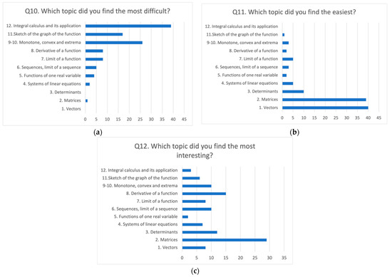 The most interesting topics for students were topics 2, 8, and 3—matrices, derivative of functions, and determinants, respectively. This result was surprising. From our experience, students consider the content of the first part of the Mathematics 1 course (Linear Algebra) easier. Students do not consider the content of one real variable’s function to be simple, which may be the reason for its unattractiveness. From this point of view, it is surprising to find that derivative of functions was among the most interesting topics.