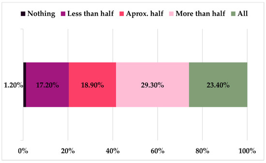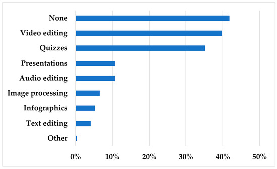 The percentage of self-developed materials was very high, since more than 50% of the participants indicated that all or more than half of the materials were developed by themselves (Figure 4). Furthermore, 69.7% of the participants acknowledged that, prior to the ERT situation, they did not have any ready-to-use or collected material usable in a remote teaching environment or simply an insufficient quantity. In this sense, 60.2% of the respondents used specific software for mathematics to make their own materials.