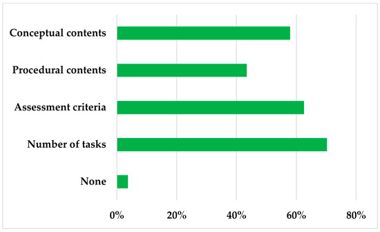 Regarding items related to content, 77.5% of the teachers surveyed answered that they taught new content, but mainly (90.1%) by slowing down the pace of the teaching compared to the previous situation. Considering the topics they taught, teachers were also asked if they had to reduce/soften their depth or extension (Figure 5). Teachers indicated that they had to reduce/soften conceptual content (55.7%), procedural content (41.8%), assessment criteria (60.2%), and, mainly, the number of tasks (67.6%). Of the four referred features, 23.4% of the teachers had to reduce/soften them all.