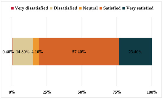 Regarding how difficult it was to adapt to the ERT situation, only 7.8% said it was not difficult, 25% said it was a bit difficult, 43.6% declared it was quite difficult, and 24.6% said it was very difficult. When asked about the comparison between the workload before and during the ERT, 82% of the teachers said they worked much more during the ERT than in normal conditions, 13.5% said a little more, 2.5% the same, and only 1.6% less and 0.4% much less. However, when asked about their satisfaction with the work done during the COVID-19 pandemic, 80.8% were satisfied or very satisfied (Figure 6).