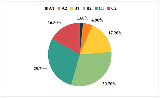 When asked about their perception digital teaching competence according to the INTEF framework, more than three-quarters of the participants classified themselves as intermediate (B2) or advanced (C1 and C2) levels (Figure 7). Moreover, 59.5% of the participants considered that their level of digital competence was rather or totally adequate to face the ERT situation caused by the COVID-19 pandemic, while 31.6% considered it sufficient, 8.2% quite inadequate, and only 0.8% totally inadequate.