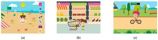 Print screens of games from the app Healthy Kids: (a) Beach; (b) Supermarket; (c) Physical Activity.