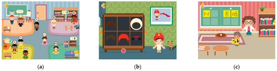 Citizen Kids in the citizenship app, that addresses the subthemes of civility, multiculturalism and preservation of cultural heritage (Figure 3). It has five games: (1) Play Areas—distribute children in the areas of the kindergarten classroom. In each area, there can only be a certain number of children (e.g., dollhouse can have 4 characters, library—2, paintings—3). The player has to distribute the characters in the areas, taking into account their wishes that are shown in thought bubbles. When there are too many characters wanting to go to an area, they have to wait for their turn. They stay in the queue, until the player removes one that has been there for a long time. (2) Playground—distribute characters in the playground, similarly to the previous one, but outside. The characters must be distributed among different spaces: slide, sandbox, hopscotch, soccer. (3) Behavior Board—a board divided into two sides. On the left side there is the correct symbol and on the right side there is the wrong symbol. In the game, children explore a room where they discover notes with correct attitudes (lift the finger to speak) and wrong attitudes (push, throw tantrums) and they can build a board, choosing the correct and wrong behaviors, with the notes they prefer. (4) Clothes of the World—dress dolls with clothes that represent different countries and customs in the world. Players can choose a country on the map and see the typical costume. Then they can open the closet to choose clothes and dress the doll according to the costume or otherwise, as they wish. When they open the closet the clothes change, to give them several options; (5) Preservation of Heritage—on a walk down the street, the character goes through places that he can help preserve, for example, picking up papers from the floor, washing a statue with a hose, fix a broken church-stained glass, tearing wall posters.