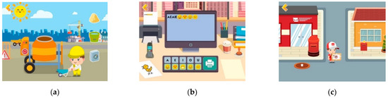 Busy Kids is the profession awareness app that offers games about different jobs and routines (Figure 4). It has five games. (1) Postman—the character has to sort mail, deliver mail to addresses in a street, following a map and directional arrows to advance in the scenario. (2) Fashion Designer—the player chooses fabric patterns, cuts fabrics according to shapes, decorates clothes with props; (3) Builder—mix cement, lay bricks, build walls according to different geometric shapes; (4) Office Worker—uses the computer, answers the phone, uses paper, pens, stamps and other office supplies. (5) Mechanic—changes tires, paints cars, replaces headlights, among others.