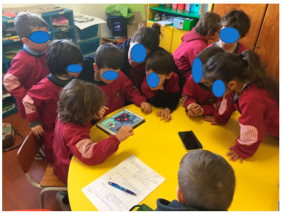 The evaluation phase aimed to test the prototypes with users, to correct or validate the direction of technological development. It was carried out in a kindergarten classroom, with an educator and 22 children, aged three and six years old, as the use in the context and the interaction between users was essential for the evaluation [38]. Data collection was based on the observation of the use of prototypes by the children and the educator. At the end of the observation sessions, an interview was conducted with the educator. The specific objectives of this evaluation were: