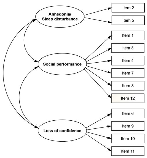 Cronbach’s α ranged between 0.42 (for anhedonia/sleep disturbance) and 0.85 (for social performance). The CR values exceeded the recommended computation of 0.60 for all three subscales (Table 4).