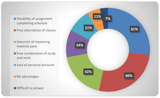 Overall, just over half of the students expressed a positive attitude towards the form of distance learning (55%, while 33% responded negatively). Nevertheless, over half of the respondents (54%) prefer to combine two learning formats: traditional, with personal attendance at classes and direct communication with teachers, and electronic, with a more flexible training schedule (Table 1). The results coincide with an analysis of the prospects for mixed learning in international studies, which highlight as meaningful grounds for its preference, in particular, stimulating the students’ motivation to learn, the effectiveness of information assimilation in cooperation with the teacher [37,38] and more freedom in the questions and suggestions exchange [39,40].