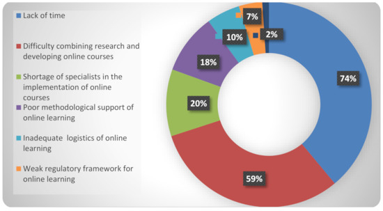 Most of the teachers (74%) singled out difficulties associated with limited communication time as a problem of work organization in the online learning system. Over a half of the respondents (59%) indicated the problem of combining scientific work and the creation of developing online courses, 20% noted the lack of specialists in the implementation of online courses. Less than 20% of the interviewed teachers associate the problems of e-learning organization with methodological (18%), logistic (10%), and regulatory (7%) support (Figure 2).