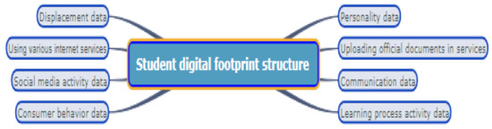 A systematic approach to assessing education quality using digital footprint technology is focused on the personalization prospect in the development of smart learning by the students’ claims and personal inclinations concerning their professional growth [12]. Within the educational analytics framework, topical issues are related to clarifying the content of such structural elements of the electronic university environment as “digital footprint”, “digital student portrait”, “digital profile/passport”, “route/trajectory”, as well as their specificity and functionality. Otherwise, the language of constructing and explaining the strategic directions of the educational sphere development turns out to be divorced from social reality, from the agents’ understanding of the essence of their activity in digital and adjacent spaces [13,14,15].