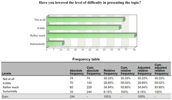 Regarding the level of difficulty, most of the teachers (about 94%) point out that it did not change substantially, and 59% of the teachers did not lower their learning standards, as shown in Figure 1.
