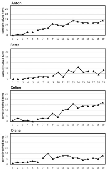 Regarding Diana’s less-notable results in comparison to the other participants, it should be mentioned that she and her tutor did not harmonize well and that she was dealing with difficult circumstances in her private environment, which she reported during the treatment. Another reason for the different rate of improvement across a multiple baseline design could be found in the suggestion that some students who are over-reliant on counting-base strategies might improve less than others [60]. Still, she was able to increase her performance, albeit to a lesser extent.