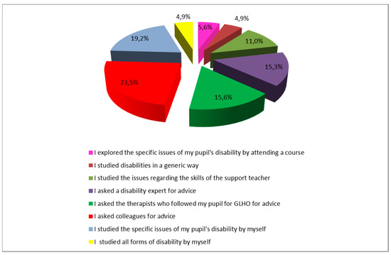 As shown in Figure 1, the most used strategies to deal with the difficulties encountered by the teacher with his pupil regard the possibility of asking for advice from colleagues (23.5%) and independently studying the specific issues of the disability of the pupil (19.2%). On the other hand, the less used strategies are constituted by: “independent study of disability in general” (4.9%), “I studied disabilities in a general way” (4.9%), and I attended “explores the specific issues of my pupil’s disability by attending a course” (5.6%).