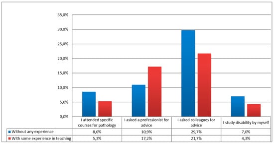By comparing the group with no experience on support with that with experience on support (Figure 2), it is highlighted that the strategy used to overcome the difficulties for the former is to turn to a colleague for advice: the option is equal to 29.7% among all those indicated by those who have no experience. For those with experience as a support teacher, it is noted that the solutions activated are: contact “a professional in the sector” (+19.2%), “the therapists who followed my pupil during the GLHO” (+36.3%), or independent study of the “specific issues of my pupil’s disability” (+14.1%).
