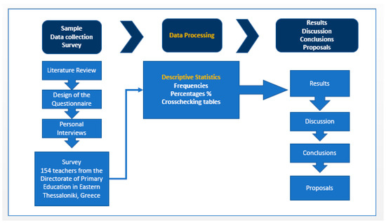 The flow chart in Figure 1 depicts the research methodology used in the survey. First, an elaborative literature review took place, followed by the design of a structured questionnaire, which was the tool for data collection. Personal interviews were then organized, addressing 154 teachers from the Directorate of Primary Education in Eastern Thessaloniki, Greece. The collected data were processed by the application of descriptive statistics. The results were discussed, and important conclusions were extracted. Any insightful proposals were highlighted and characterized by transferability and applicability for improving training and capacity building in environmental education, within pre-primary and primary school environments.