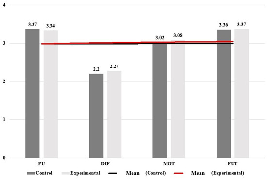 Mean difference between control and experimental groups. Note: PU = Perceived use-fulness; DIF = Difficulty; MOT = Motivation; FUT = Future applicability.