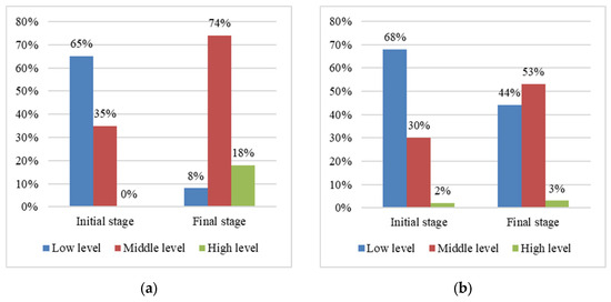 Levels of students’ soft skills development at the initial and final stages of the experiment: (a) In the experimental group; (b) in the control group.