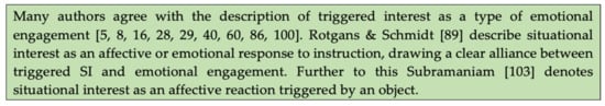 Indeed, many authors agree that the description of interest is not something that is developed by engagement, or happens alongside it, but that it is a type of emotional engagement [25,37,57,62,77,94,101,102,103]. Rotgans & Schmidt [24] describe situational interest as an affective or emotional response to instruction. Subramaniam [104] denotes situational interest as an affective reaction triggered by an object. This indicates that interest can also be defined as a form of emotional engagement. It is evident that the constructs are inherently connected in the literature, as they are here in their reactive form to the para-hook teaching.