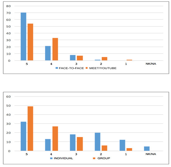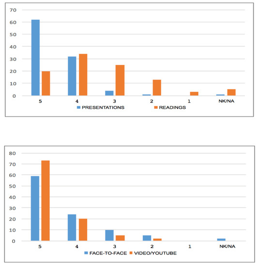 The most relevant results are also shown in the figures below, in which the Y axis shows the number of students, and the X axis the Likert scale (values between 1 and 5) and the NK/NA answer. Figure 1 (top) corresponds to the assessment by the students of the teacher’s explanations compared to the reading of PDF documents by themselves. The PowerPoint presentations of the subject content by the teacher were rated as very useful by 62.7%, as opposed to focusing on readings (articles or books) by themselves (21%) and studying independently. Moreover, 73% of students consider the recorded videos to be more useful, so as to be able, in their own words, “to watch the video as many times as they wish”, as well as to be able to stop it at any time to take notes on the presentations or explanations from the teachers. In Figure 1 (bottom), the scores of the students of the face-to-face theoretical lessons are shown versus the online format recorded on video or YouTube channel.