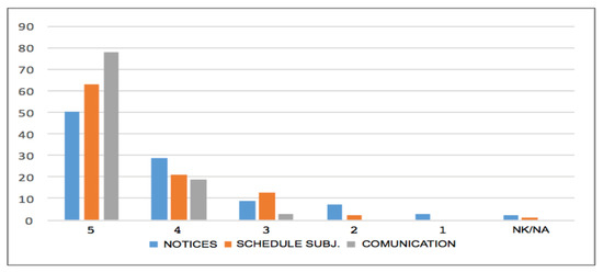 In Figure 2 (top), the scores of the practical lessons are shown in the face-to-face model compared to the same type of lesson but online. What the students said is that the former, the face-to-face lessons, are more useful than the latter. Related to this, Figure 2 (middle) shows the students’ assessment regarding the way of working (individual versus group), considering working in groups as more useful than individually. Finally, Figure 2 (bottom) shows the students’ assessment of the usefulness or the uselessness of the use of notices on the online platform of the subject, as well as a schedule of the subject created by the teacher, and the communication of the students with him/her, with the latter being the best rated by the surveyed students.
