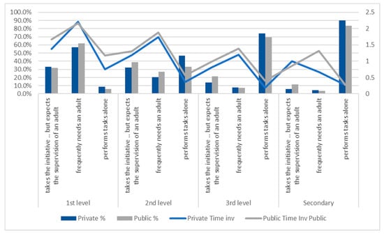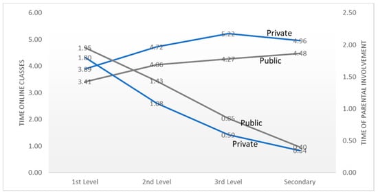 The involvement of the parents and the online classes’ time is also related to the type of school attended, with public schools’ parents spending more time supporting their children than private schools’ parents, and with private schools providing more online classes time in all levels of education. The higher time spent in online classes in private schools may be an explanatory factor for the lower parental involvement in this type of school. The differences observed in the graph (for the two time variables) are statistically significant as concluded from an ANOVA test for two factors.