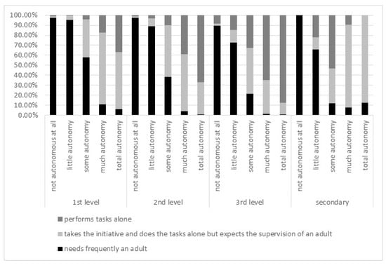 If the variables ‘student autonomy’ and ‘how students perform tasks’ were in full agreement, one would expect, within each level of education, a reduction in the black columns’ (frequently needs an adult) percentages when the perception of autonomy increases. On the other hand, one would expect the dark grey column (performs tasks alone) to be the maximum for the level of perception of ’total autonomy’. While the former indeed happens, the latter does not happen for all levels of education. Indeed, secondary education students perceived as totally autonomous by their parents are also perceived as still needing the supervision of an adult. Only in the third level of education does the dark grey column dominate the total autonomy category.