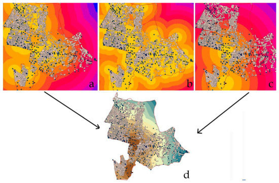 Estimation of combined accessibility to different points of interest within an urban sector of Athens using map algebra: (a) Distance from commercial facilities, (b) Distance from public buildings, (c) Distance from metro stations, (d) Combined accessibility.
