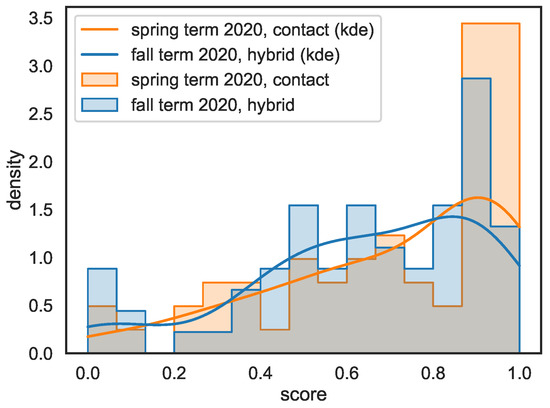Teaching evaluation scores for the ML course. Two teachers were assessed, and the average score is presented (spring 2019: , and fall 2020: ).