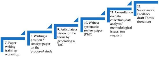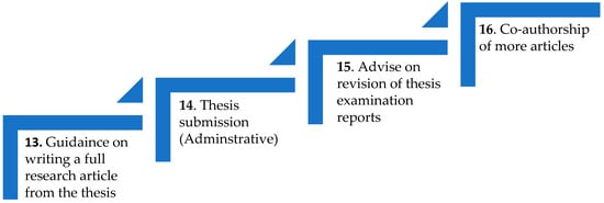 The set of good practices outlined in Section 5.2 typically defines the process that I have adopted for my supervision. After the foundational support that is provided in the early stages (Figure 1). Students are further supported albeit in a more withdrawn way after they have passed their proposal examination. Post-proposal, I engage more with students in groups through workshop and tutorial sessions. The activities in Figure 2, which are listed as #7–#12 are initiated as workshop or seminar sessions for specific student groups. Each student will then apply what they have learnt by writing a paper which will be reviewed by me, with feedback provided. The one-to-one interaction with individual students will continue until the paper is submitted. Any need for consultation on data collection, data analysis, or methodology (#11) will have to be requested by a student if it is deemed necessary. Students receive feedback and inputs on their draft theses when it is submitted to me for review and feedback. This is also an iterative process until acceptable quality is attained from my perspective as the supervisor.