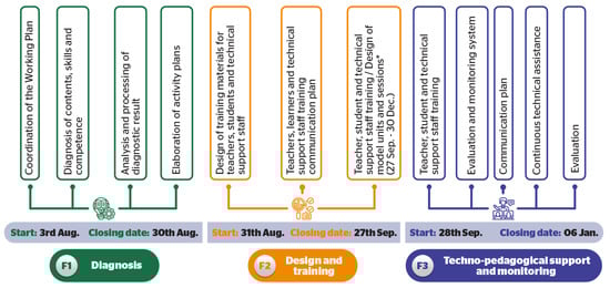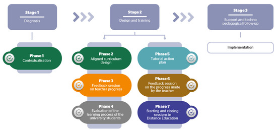 As mentioned in the Introduction, the consultancy process consisted of three stages: the first, Diagnosis; the second, Design and Training; and the third, Techno-pedagogical Support and Follow-up. Each phase had its own identity and a completely different working structure. To facilitate its understanding, we present the methodological structure of the project (Figure 2).
