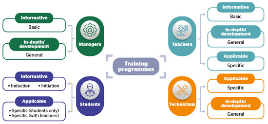 The different techniques and instruments used to collect information during the previous phase (Table 1) made it possible to identify the training needs for each of the players involved (managers, teachers, students and support technicians) in the universities, and to generate a training plan sequenced in time and objectives, giving rise to three training programs (informative, in-depth and development and implementation) which are organised, at the same time, into 83 courses and workshops called, in general terms: basic, general, and specific (Figure 3).