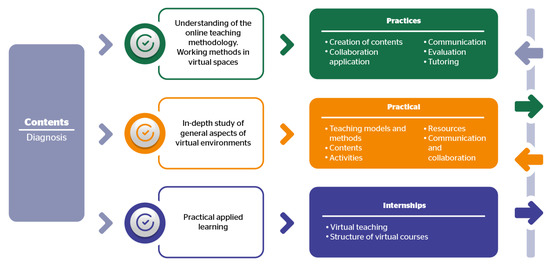 The training plan strengthened the skills-based curriculum, offering a wide space for digital competence as a key skill to enable better professional, academic, managerial, or technical performance of the target audience in virtual/online contexts [23]. Self-regulation learning strategies [24,25,26,27] were used as the basis of an active and constructive process, by which the person sets their own learning objectives, trying to monitor, regulate and control their thoughts, motivation, and behavior according to their goals [28,29]. Everyday learning [30,31] was prioritised, focusing, and reflecting on what was important before moving forward and constructing new idea-generating links [32,33,34].