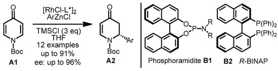 - Guo, F.; McGilvary, M.A.; Jeffries, M.C.; Graves, B.N.; Graham, S.A.; Wu, Y. Rhodium(I)-Complexes Catalyzed 1,4-Conjugate Addition of Arylzinc Chlorides to N-Boc-4-pyridone. Molecules 2017, 22, 723. [Google Scholar] [CrossRef] [PubMed] [Green Version]