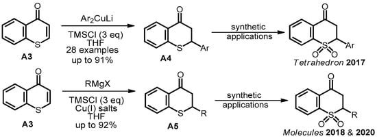 The development of conjugate addition to thiochromones. We also developed the first diarylcuprate conjugate addition to thiochromones A3 and provided a rapid entry into an important class of S-heterocycle—thioflavanones A4 in excellent yields (Figure 2) [17]. Three WSSU undergraduate students from a minority group as well as two high school student interns contributed to the reaction development and are coauthors for this publication [15]. We also further expanded the scope of the conjugate additions to thiochromones by taking advantage of the ease of preparation and the broader scope of Grignard reagents compared to other organometallic reagents such as organolithium reagents. This approach allows the synthesis of 2-substituted thiochroman-4-ones A5 that were otherwise unavailable with other organometallic reagents [16]. The Cu (I) salts can be reduced to 10% and the reactions can be carried out at milder reaction conditions (Figure 2). The 1,4-adducts attained can be utilized for additional synthetic applications for bioactive S-containing heterocycles [18,19]. These NSF grants allow the PI to purchase instruments and chemicals, set up a research lab and develop a sustainable active research program for under-represented/underserved minority (URM) students at WSSU. These funded research activities are vital in increasing the engagement of individuals from under-represented groups in the chemistry enterprise, decreasing the barriers experienced by these individuals in chemistry, and promoting the diversity, equity, and inclusion in chemistry education.