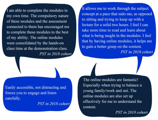 From the PSTs’ feedback (see Figure 2) it is clear that they appreciate the flexibility that the online modules offer, allowing them to engage with the material at a time and place that best suits them. The chunking of the material in each module, as well as the length of time allocated to each (i.e., two weeks per module), enables the PSTs to work at their own pace which was seen as much more agreeable to the PSTs’ schedule than a fixed two-hour lecture on campus. The format of the online modules was also reported to be more engaging and facilitated the PSTs’ deepening understanding of the concepts presented.