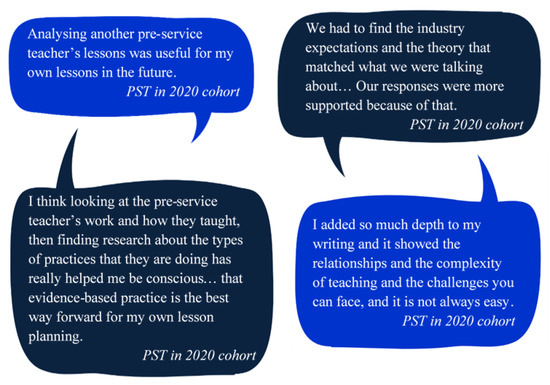 Our creative adaptation of the teaching and assessment tasks in light of the unusual circumstances that COVID-19 presented resulted in PSTs reporting similar benefits from the non-placement WIL opportunity as other PSTs (both in previous EDPD202 cohorts and in the research literature) have identified for place-based WIL activities (see Figure 3). PSTs prepared deep reflections that were grounded in theory, practice, and policy. The PSTs identified that their engagement in the non-placement WIL task affected their ongoing development. Notably, even without being in a classroom, PSTs in this cohort were able to experience a realistic sense of the complexities inherent within the teaching profession.